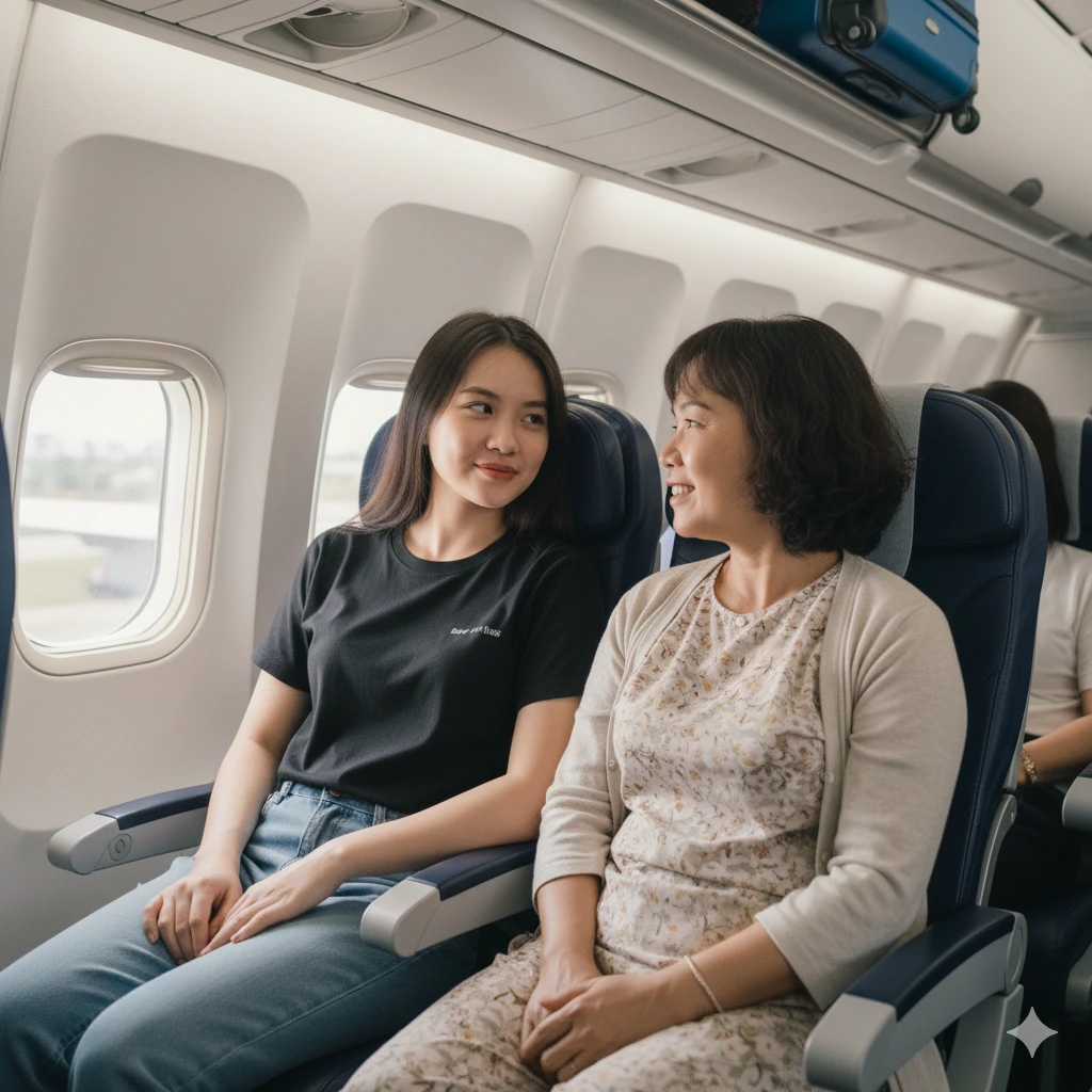 Máy bay trễ chuyến gần ba mươi phút. Tôi tựa đầu vào ghế, khẽ nhắm mắt. Khi mở ra, một bác gái đã ngồi xuống bên cạnh, dáng nhỏ nhắn, gương mặt phúc hậu. Cô nhìn tôi, mỉm cười: