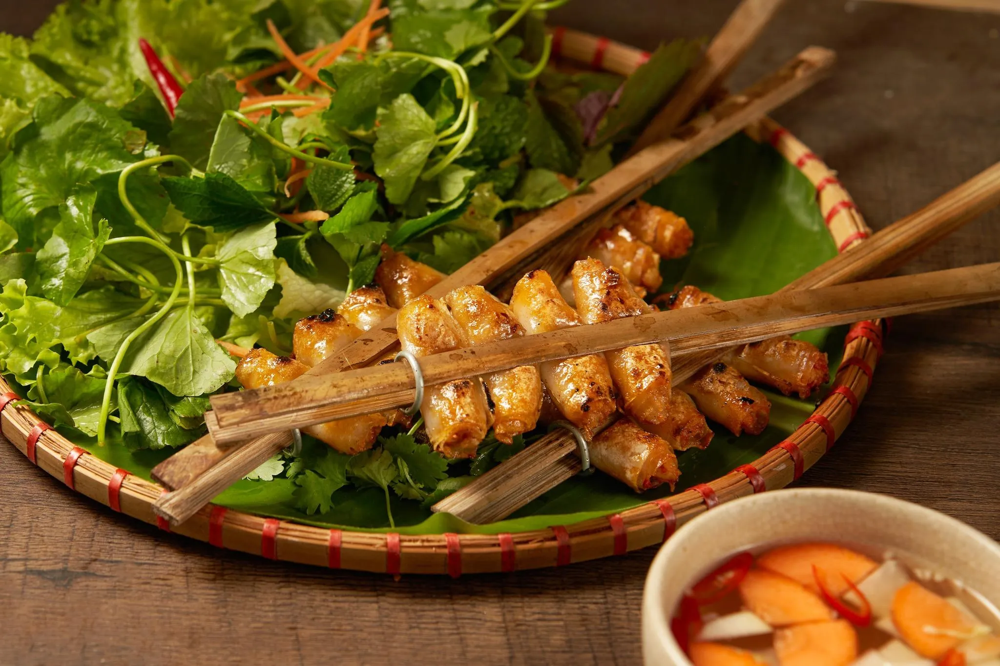 Bánh phở cuộn tôm tươi nướng than hoa, ăn kèm rau sống và nước chấm chua ngọt. Món ăn tưởng dân dã mà lại tinh tế, thể hiện sự khéo léo của người xứ Thanh.