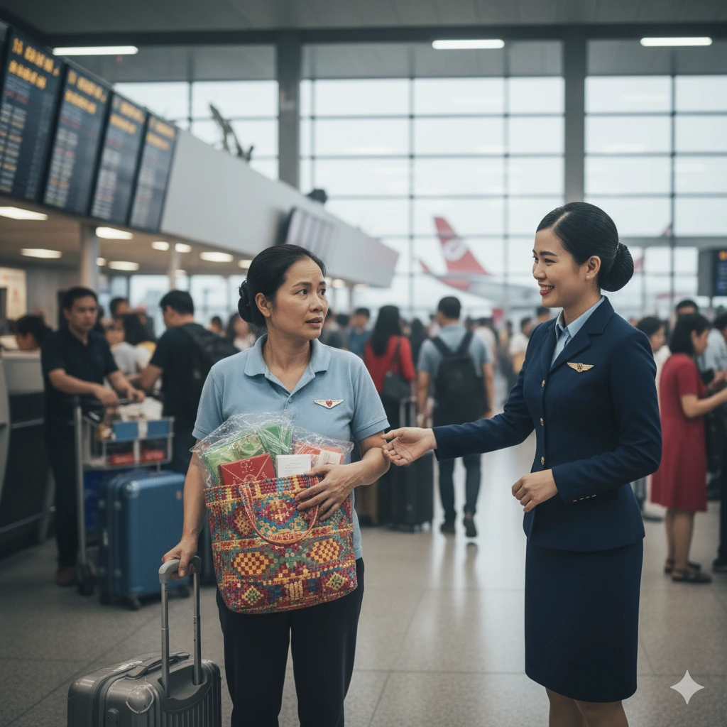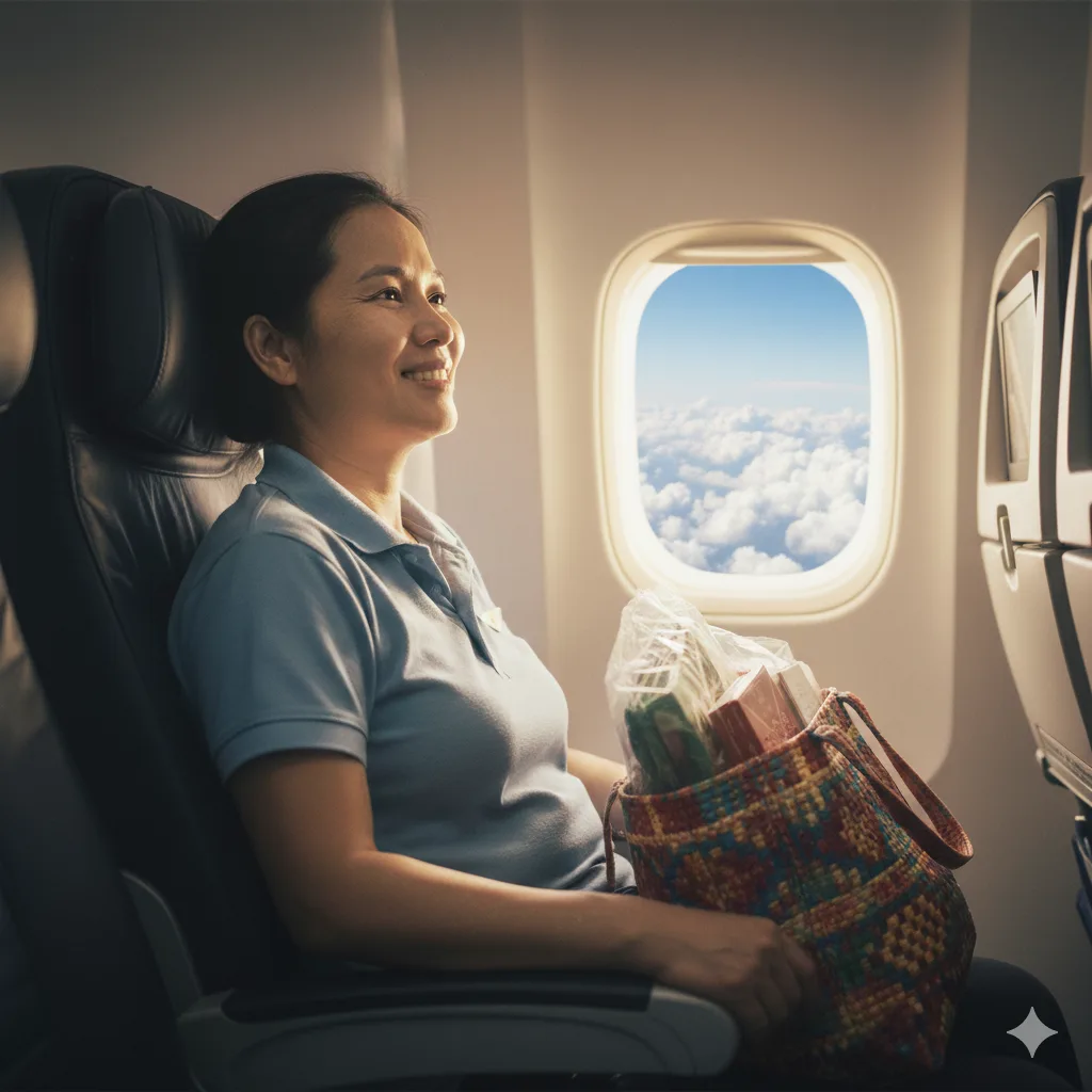Ngày bay đã đến, không khí tại sân bay Tân Sơn Nhất náo nhiệt và hối hả, như một dòng sông người đổ về quê hương. Hạnh khoác lên mình chiếc áo mới tươm tất nhất, ôm theo hai túi hành lý to ụ đầy ắp tình thương. Lần đầu tiên đối diện với quy trình phức tạp và đám đông xô bồ, cô cảm thấy hơi run, bàn tay gầy nắm chặt chiếc vé điện tử in ra từ tiệm Internet. Hạnh đứng lóng ngóng trước quầy check-in, ánh mắt bối rối cố gắng tìm hiểu xem mình phải làm gì tiếp theo.